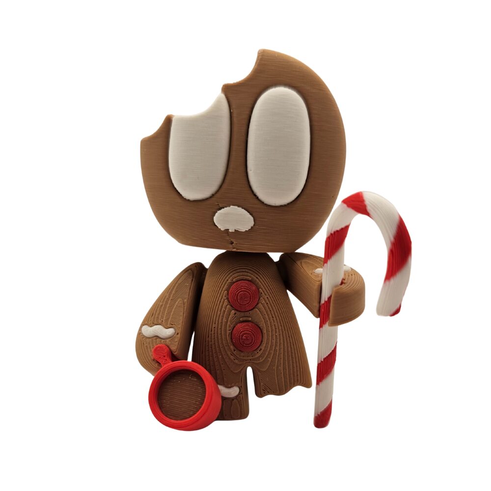 Charakterystyczne brązowe ciało z widoczną teksturą przypominającą prawdziwe ciastko, duże białe oczy z zdziwionym spojrzeniem, małe usta i czerwone guziki na brzuchu tworzą pełną humoru kompozycję. Białe akcenty przypominające lukier na rękach i nogach dodają autentyczności. W jednej ręce trzyma tradycyjną cukierkową laskę (candy cane), a w drugiej czerwone pierniczkowe ciasteczko – dowód na to, że nie mógł się powstrzymać od objadania.