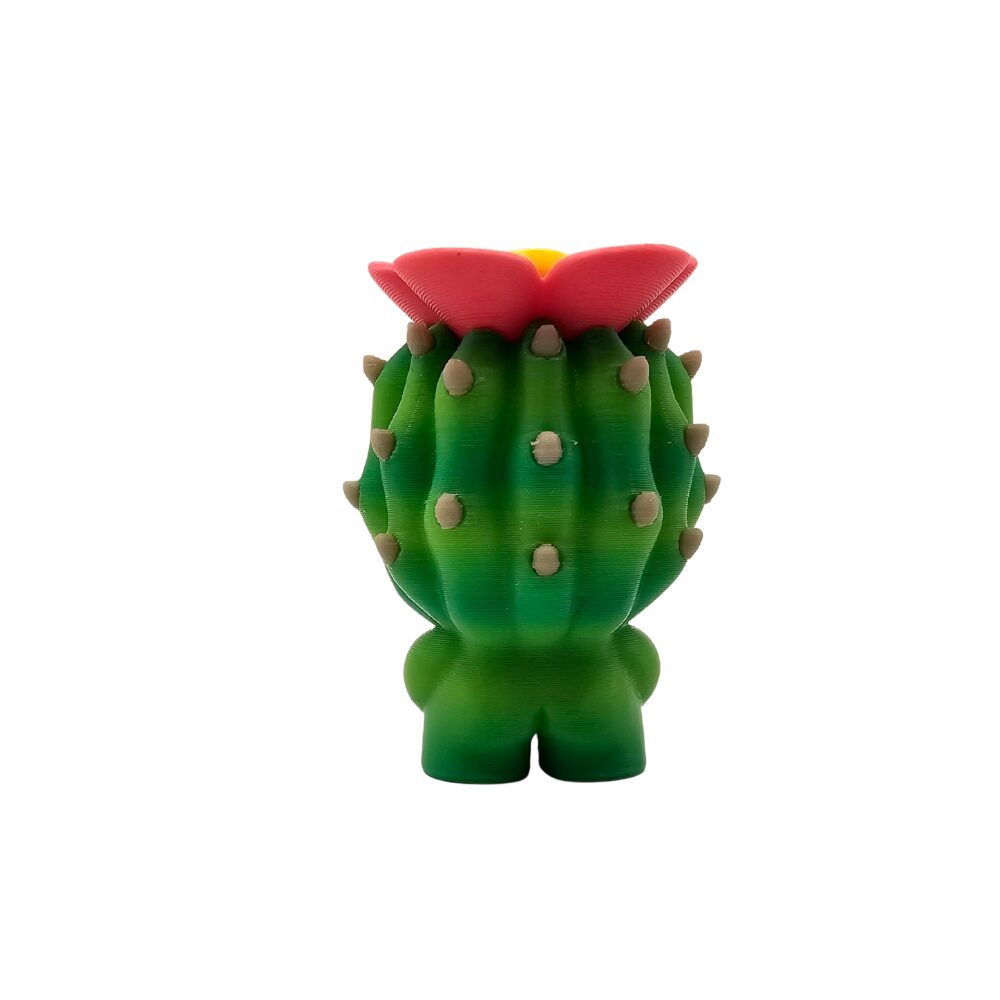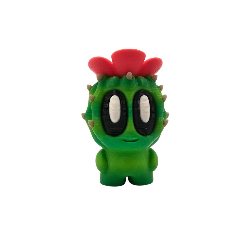 Opuncja ma intensywny, soczysty zielony kolor charakterystyczny dla kaktusów. Wykonana jest z gładkiego, matowego tworzywa sztucznego przy użyciu technologii druku 3D z filamentów. Składa się z charakterystycznych płaskich, owalnych łopat kaktusa opuncji. Duże czarno-białe oczy i mały uśmiech nadają kaktusowi kawaii charakter, sprawiając że roślina wygląda jak żywa, przyjazna postać. Czerwony kwiatek na szczycie jest wyraźnym, kolorowym akcentem symbolizującym kwitnącą opuncję. Charakterystyczne jasne kropki na całej powierzchni reprezentują miejsca, gdzie u prawdziwego kaktusa rosłyby kolce. Detale są precyzyjnie wykonane dzięki technologii druku 3D. Widać wyraźne łopaty kaktusa ułożone charakterystycznie. Widać duże, ekspresyjne oczy. Widać czerwony kwiatek na szczycie. Widać jasne kropki na całej powierzchni. Widać naturalny kształt opuncji. Powierzchnia ma charakterystyczne, lekko widoczne warstwy typowe dla druku 3D, co nadaje figurce unikalny, rękodzielniczy charakter.