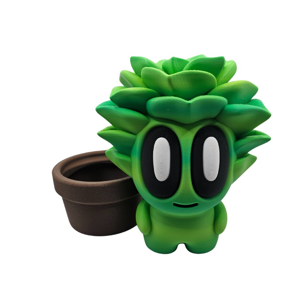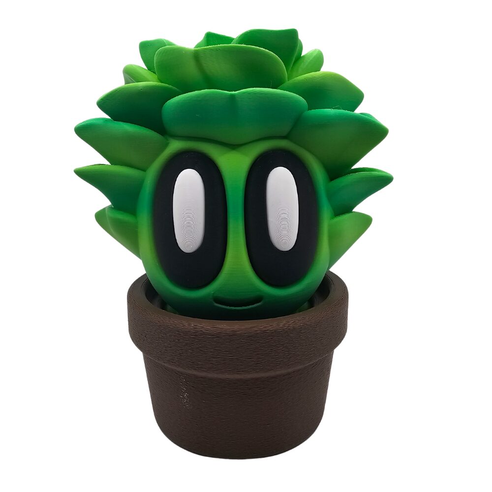Sukulent ma intensywny, soczysty zielony kolor. Liście są ułożone charakterystycznie jak u prawdziwego sokulenta. Duże czarno-białe oczy nadają postaci kawaii charakter. Brązowa doniczka dopełnia całość.