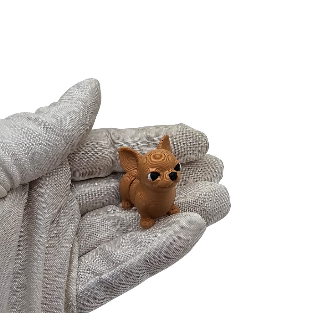 Chihuahua ma charakterystyczną brązową kolorystykę i proporcje typowe dla tej najmniejszej rasy psów na świecie. Wykonana jest z elastycznego tworzywa sztucznego przy użyciu technologii druku 3D flexi. Brązowe futro w ciepłym odcieniu pokrywa ciało psa, tworząc naturalny, przyjemny kolor. Duże czarne oczy w stosunku do małej główki są najbardziej charakterystyczną cechą chihuahua i nadają mu kawaii charakter oraz uroczy, ciekawy wyraz typowy dla tej rasy. Ogromne spiczaste uszka sterczące w górę jak u nietoperza to druga najbardziej rozpoznawalna cecha chihuahua – uszy są nieproporcjonalnie duże w stosunku do małej główki. Czarny nosek jest charakterystyczny dla psów. Mała głowa w kształcie jabłka jest typowa dla chihuahua. Drobna, delikatna budowa ciała jest charakterystyczna dla najmniejszej rasy psów na świecie. Chihuahua ma ruchomy tors, który można delikatnie zginać i ustawiać w różnych pozycjach. Cztery małe łapki są charakterystyczne dla chihuahua. Miniaturowy rozmiar jest typowy dla tej rasy – chihuahua to najmniejszy pies na świecie. Siedząca poza jest typowa dla uroczych chihuahua. Detale są precyzyjnie wykonane mimo małego rozmiaru dzięki technologii druku 3D. Widać wyraźne brązowe futro. Widać ogromne uszka. Widać duże czarne oczy. Widać małą główkę. Widać drobną budowę. Charakterystyczna struktura flexi pozwala na zabawę i interakcję z figurką. Powierzchnia ma charakterystyczne, lekko widoczne warstwy typowe dla druku 3D, co nadaje figurce unikalny, rękodzielniczy charakter.
