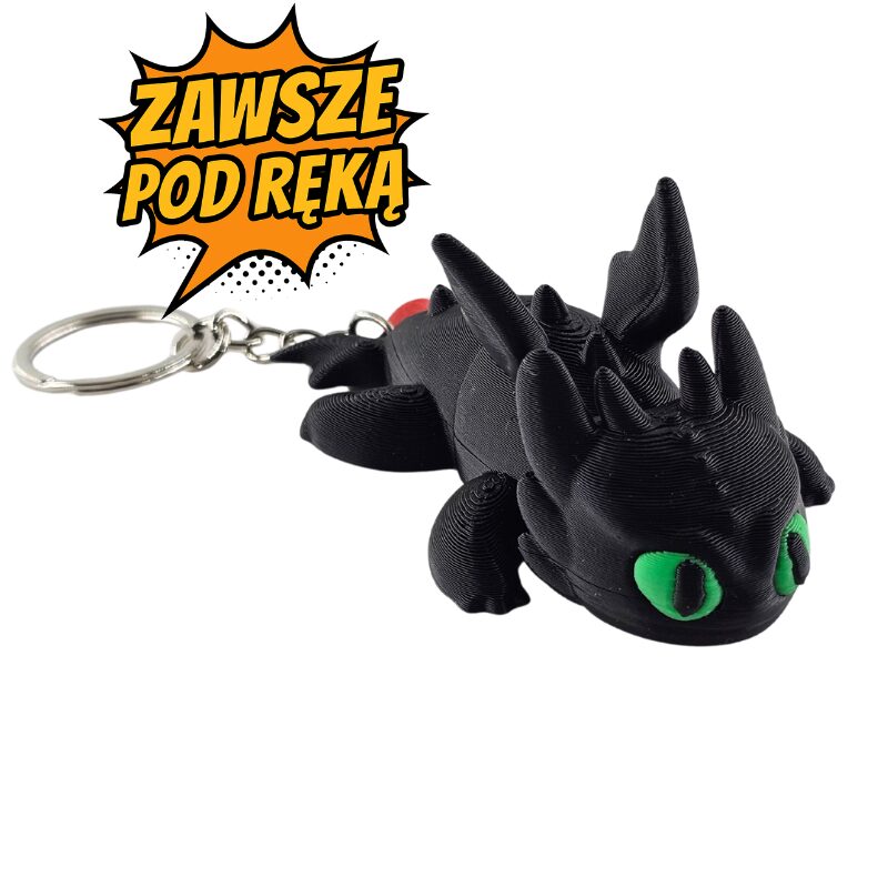 Czarny Smok Brelok to mała figurka smoka z karabińczykiem. Ma głęboki czarny kolor i charakterystyczne zielone oczy. Wyróżnia się sympatycznym, łagodnym wyglądem. Sylwetka jest zwarta i praktyczna.