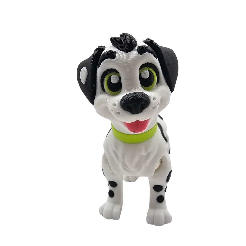Piesek utrzymany jest w białej kolorystyce z czarnymi cętkami. Obroża jest zielona. Oczy są duże. Kontrastują z resztą ciała.