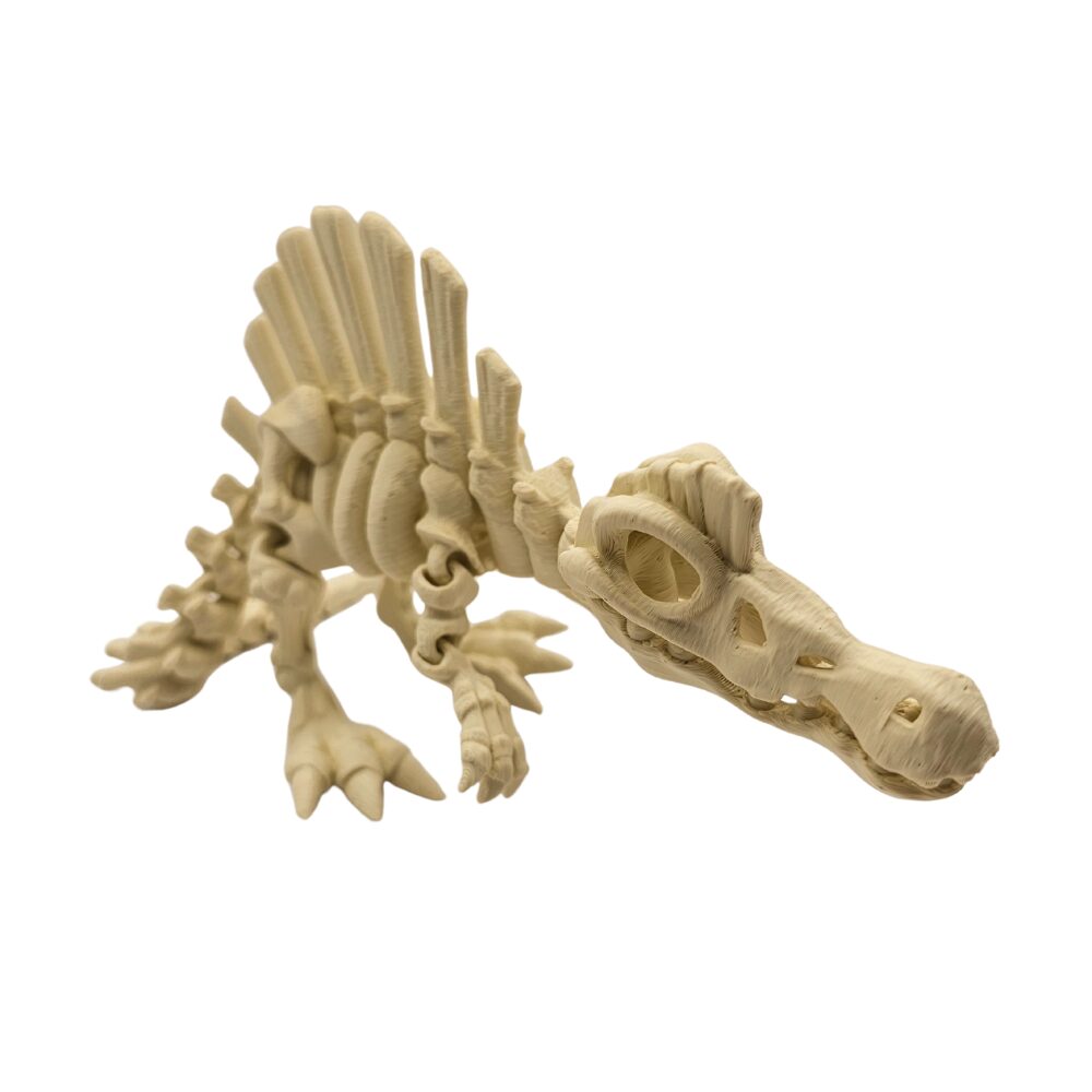 Charakterystyczna długa, wąska czaszka przypominająca czaszką krokodyla z ostrymi stożkowatymi zębami przystosowanymi do łowienia ryb, ogromny żagiel na grzbiecie zbudowany z wydłużonych wyrostków kręgowych dochodzących do 1,8 metra wysokości, masywne przednie kończyny z wielkimi zakrzywionymi pazurami, potężne tylne nogi, rozbudowany kręgosłup oraz precyzyjnie odwzorowane połączenia kości tworzą kompletny, anatomicznie poprawny szkielet. Wykonana z wysokiej jakości tworzywa sztucznego w technologii druku 3D figurka zachwyca detalami i beżową kolorystyką przypominającą prawdziwe skamieniałości.