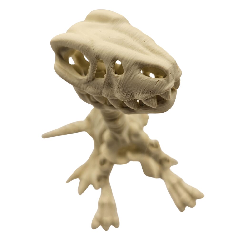 Najbardziej charakterystycznym elementem T-Rexa była ogromna czaszka z najsilniejszym ugryzieniem wśród wszystkich znanych zwierząt lądowych. Zęby tyranozaura, największe dochodzące do 30 cm długości, były zakrzywione, ostre i zdolne do miażdżenia kości. Figurka precyzyjnie odwzorowuje tę potężną szczękę z pełnym uzębieniem drapieżnika, co czyni T-Rexa natychmiast rozpoznawalnym.