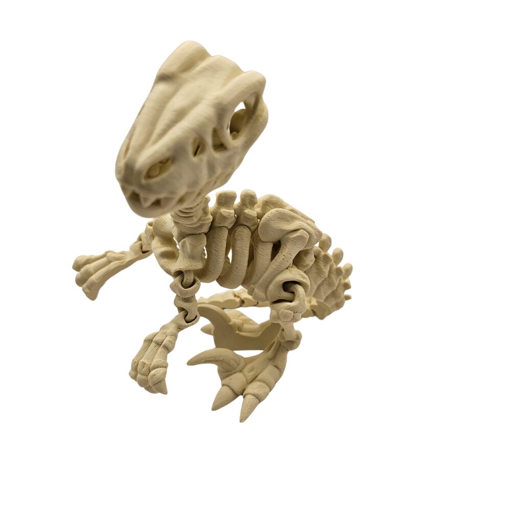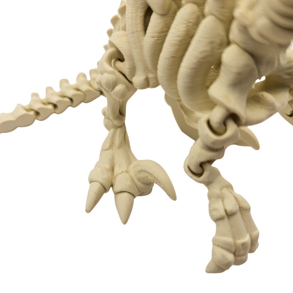 Charakterystyczna masywna czaszka z wielkimi oczodołami i pełna ostrych, zakrzywionych zębów drapieżnika, długi kręgosłup przechodzący w segmentowany ogon z technologią Flexi, klatka piersiowa z widocznymi żebrami, charakterystyczne krótkie przednie kończyny z dwoma palcami, potężne tylne nogi z ostrymi pazurami oraz precyzyjnie odwzorowane połączenia kości tworzą kompletny, anatomicznie poprawny szkielet. Wykonana z wysokiej jakości tworzywa sztucznego w technologii druku 3D figurka zachwyca detalami i beżową kolorystyką przypominającą prawdziwe skamieniałości.