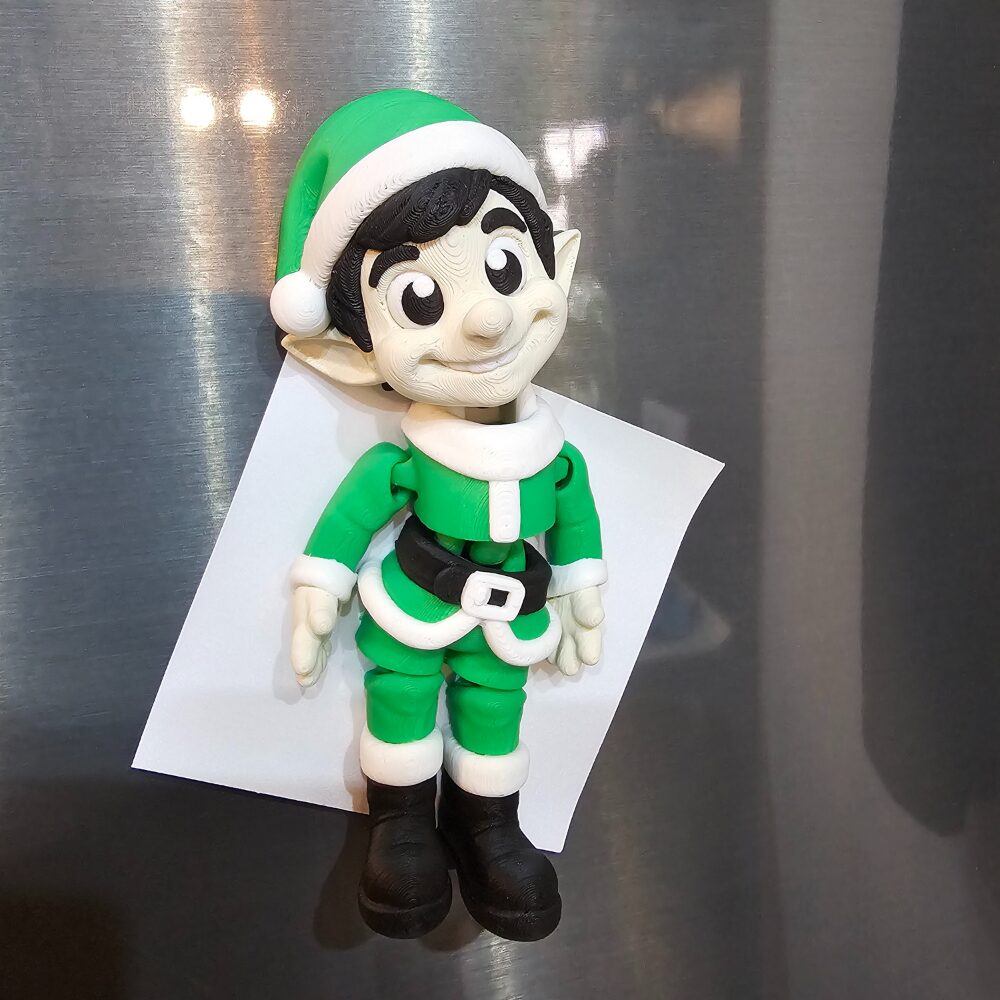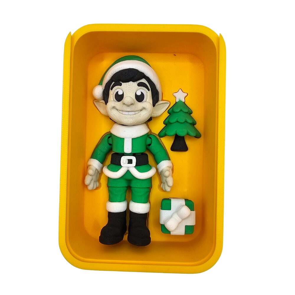 Charakterystyczna figurka elfa z beżową skórą i spiczastymi uszami typowymi dla elfów, czarne włosy, duże czarne oczy w stylu cute, zielona czapka z białym obszyciem i pomponem, zielony strój z białymi obszywkami, czarny pasek z białą klamrą, czarne buty, mini choinka z zielonymi gałązkami i białą gwiazdką na czubku, prezent w zielono-białej kolorystyce oraz żółte plastikowe pudełko/tacka z funkcją magnetyczną tworzą kompletny, funkcjonalny zestaw. Wykonany z wysokiej jakości tworzywa sztucznego zestaw zachwyca precyzyjnymi detalami i praktycznością magnetycznego przechowywania.