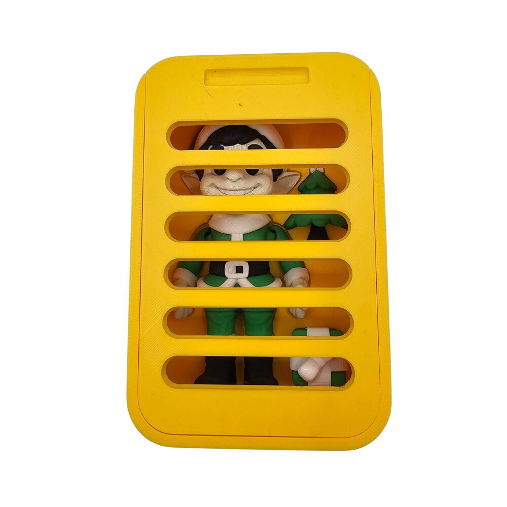 Żółte plastikowe pudełko/tacka zawierające figurkę elfa i akcesoria ma wbudowany magnes, który pozwala przyczepić cały zestaw do metalowych powierzchni jak lodówka, tablica magnetyczna, szafka metalowa lub inne powierzchnie ferromagnetyczne. Możesz wyeksponować kompletny zestaw (elf, choinka, prezent w pudełku) jako magnetyczną dekorację świąteczną, która nie zajmuje miejsca na półkach i jest zawsze na widoku w kuchni lub biurze. Magnes jest na tyle silny, aby utrzymać ciężar pudełka z zawartością w bezpieczny sposób.