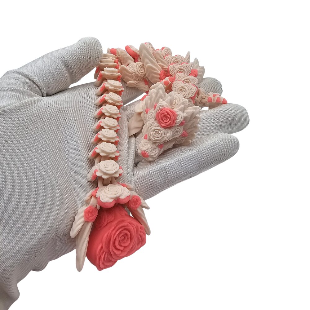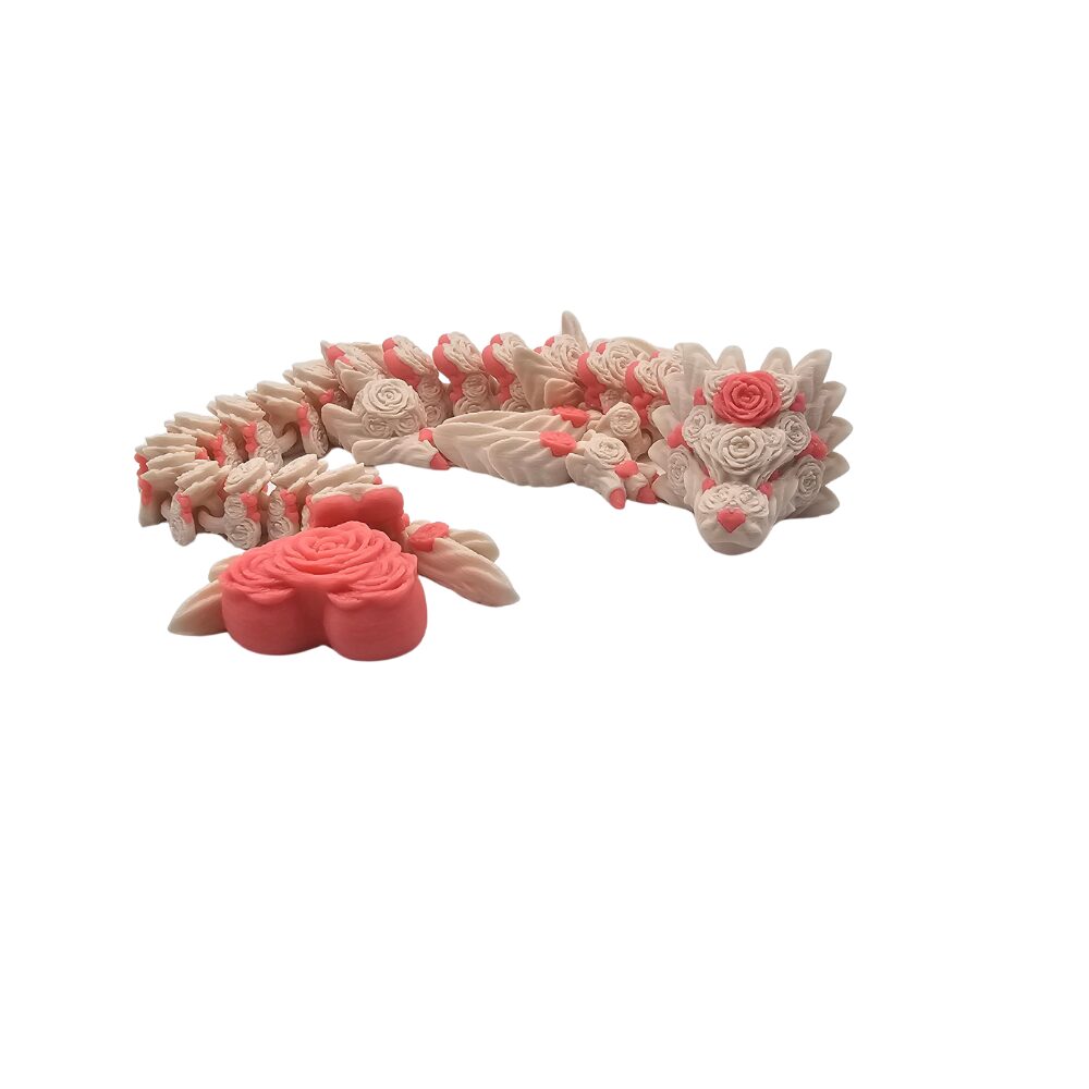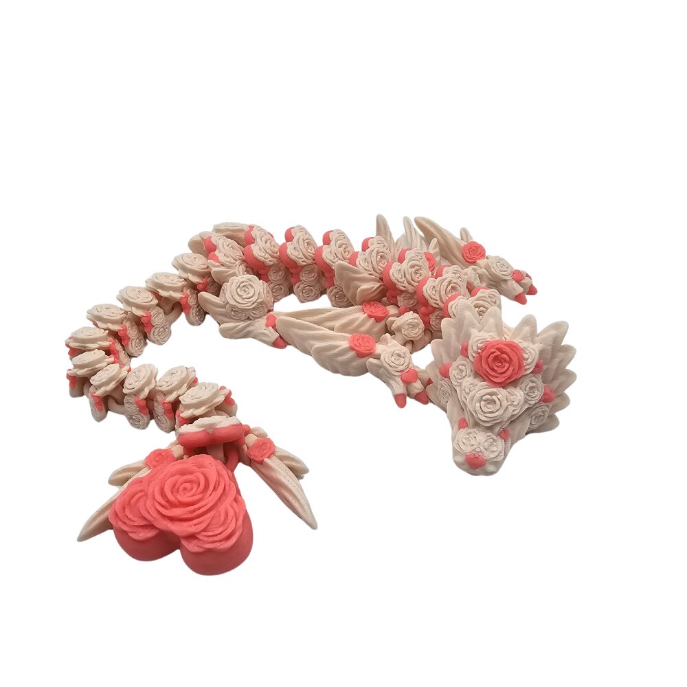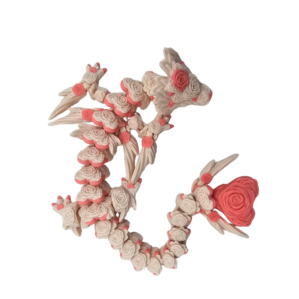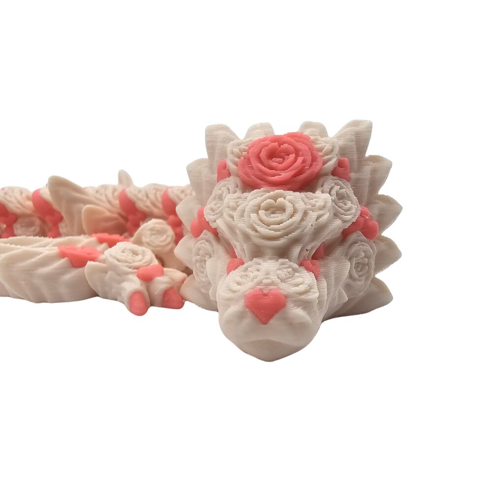 Smok ma elegancką kolorystykę w odcieniach bieli i kremu z różowymi akcentami kwiatowymi. Wykonany jest z elastycznego tworzywa sztucznego przy użyciu technologii druku 3D flexi. Białe lub kremowe ciało smoka jest długie i segmentowane w stylu azjatyckim. Różowe róże zdobiące ciało smoka są najbardziej wyrazistym elementem dekoracyjnym. Charakterystyczna głowa smoka z rogami i szczegółami jest typowa dla smoków azjatyckich. Długie, segmentowane ciało pozwala na wyginanie smoka w różne spektakularne pozy. Całe ciało jest w pełni flexi, co oznacza, że można je swobodnie wyginać, zwijać i układać w nieskończoną ilość kształtów. Możliwe łapki, skrzydła lub płetwy dodają dodatkowych szczegółów. Detale są precyzyjnie wykonane dzięki technologii druku 3D. Widać wyraźne segmenty ciała. Widać piękne różowe róże. Widać majestatyczną głowę smoka. Widać eleganckie proporcje typowe dla smoków azjatyckich. Charakterystyczna struktura flexi pozwala na nieograniczoną zabawę i tworzenie unikalnych form. Powierzchnia ma charakterystyczne, lekko widoczne warstwy typowe dla druku 3D, co nadaje figurce unikalny, rękodzielniczy charakter.