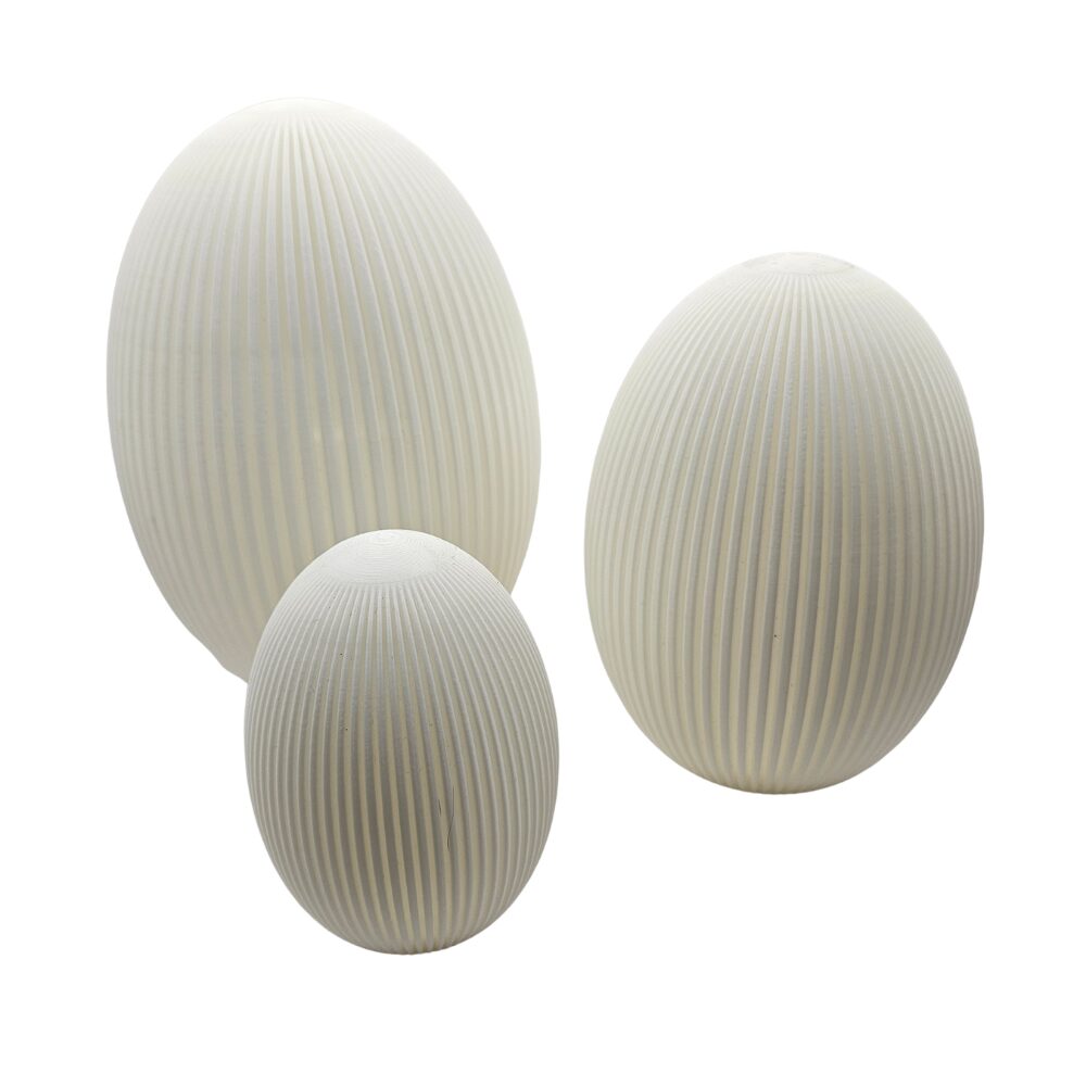 Jajka mają klasyczny kształt pisanek wielkanocnych w minimalistycznym, nowoczesnym wydaniu. Wykonane są z tworzywa sztucznego przy użyciu technologii druku 3D. Czysta biel nadaje jajkom elegancki, świeży wygląd wielkanocny. Subtelny wzór żłobkowany pokrywający całą powierzchnię tworzy delikatną, trójwymiarową fakturę charakterystyczną dla druku 3D. Pionowe rowki biegnące wzdłuż jajek tworzą rytmiczny, dekoracyjny wzór. Trzy różne rozmiary – duże, średnie i małe jajko – pozwalają na tworzenie zróżnicowanych kompozycji. Klasyczny owalny kształt jest charakterystyczny dla jajek wielkanocnych. Jajka są statyczne, bez ruchomych elementów – pełnią rolę dekoracji wielkanocnej. Detale są precyzyjnie wykonane dzięki technologii druku 3D. Widać wyraźny wzór żłobkowany pokrywający powierzchnię. Widać pionowe rowki. Widać trzy różne rozmiary. Powierzchnia ma charakterystyczny wzór żłobkowany typowy dla druku 3D, co nadaje figurkom unikalny, rękodzielniczy charakter i elegancką fakturę.