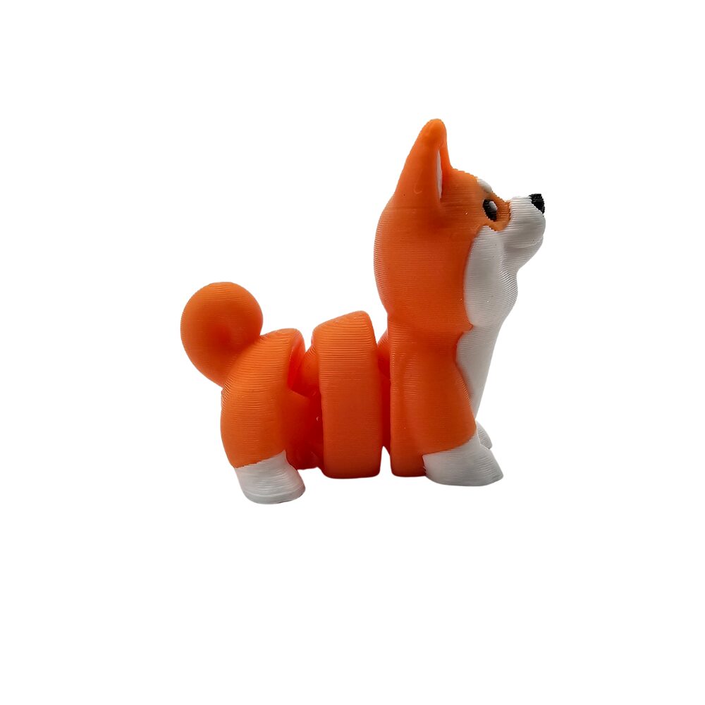Corgi ma charakterystyczną pomarańczowo-białą kolorystykę typową dla rasy Welsh Corgi Pembroke. Wykonany jest z elastycznego tworzywa sztucznego przy użyciu technologii druku 3D flexi. Pomarańczowe futro pokrywa grzbiet, głowę i boki psa, tworząc ciepły, rudawy kolor charakterystyczny dla corgi. Białe brzuszko i białe łapki są typowe dla tej rasy. Duże czarne oczy nadają corgi kawaii charakter i uroczy, radosny wyraz typowy dla psów. Czarny nosek jest charakterystyczny dla psów. Duże spiczaste uszka sterczące w górę to najbardziej rozpoznawalna cecha corgi. Krótkie łapki przy długim ciele są charakterystyczną proporcją corgi, które mają krótkie nogi i wydłużone ciało. Mała, pulchna sylwetka jest typowa dla uroczych corgi kawaii. Corgi ma ruchomy tors, który można delikatnie zginać i ustawiać w różnych pozycjach. Cztery krótkie łapki są charakterystyczne dla corgi. Jako minisek jest znacznie mniejszy od standardowych figurek flexi, co czyni go ultra kompaktowym. Siedząca poza jest typowa dla uroczych corgi. Detale są precyzyjnie wykonane mimo małego rozmiaru dzięki technologii druku 3D. Widać wyraźne pomarańczowe futro na grzbiecie. Widać białe brzuszko i łapki. Widać duże czarne oczy. Widać duże uszka. Widać krótkie łapki. Charakterystyczna struktura flexi pozwala na zabawę i interakcję z figurką. Powierzchnia ma charakterystyczne, lekko widoczne warstwy typowe dla druku 3D, co nadaje figurce unikalny, rękodzielniczy charakter.