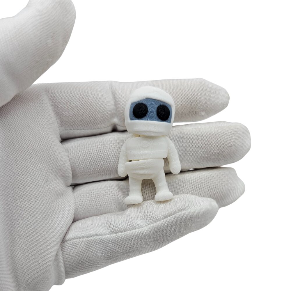 Model Mini Mumia został wykonany z wysokiej jakości tworzywa sztucznego, co pozwoliło wiernie odwzorować detale bandaży, rys twarzy i postawy rodem z filmowego potwora. Kolorystyka w odcieniach beżu, kości słoniowej i szarości podkreśla efekt starożytnego owijania, a delikatne cieniowanie nadaje figurce głębi i charakteru.