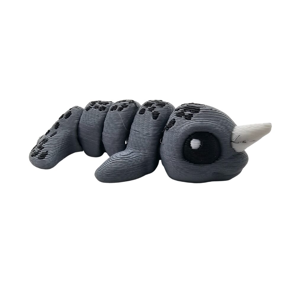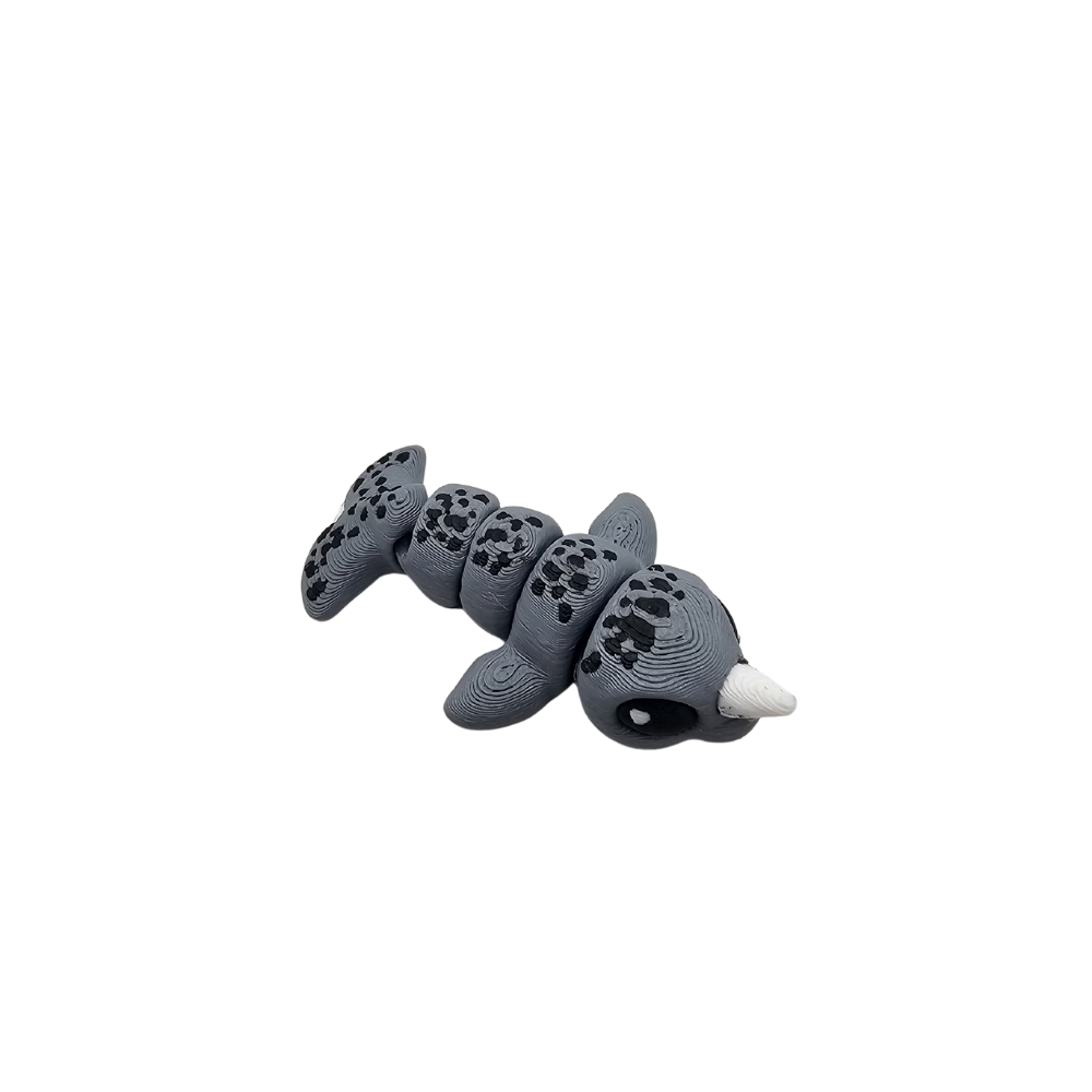 Mini Narwal | Minisek to mała figurka przedstawiająca narwala. Ma szaro-czarne ciało. Ma jasny róg na głowie. Ma duże oczy. Jego sylwetka jest wydłużona.
