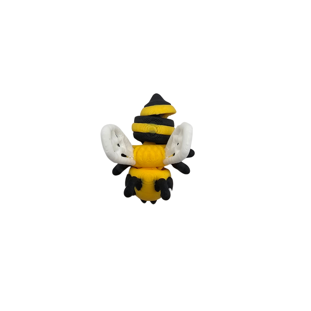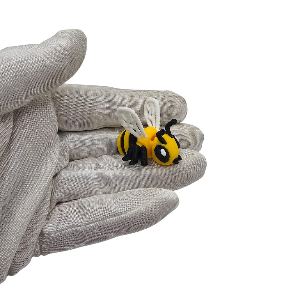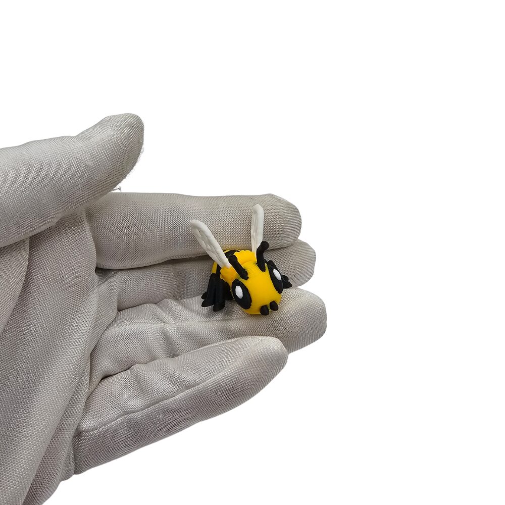 Pszczółka ma klasyczną żółto-czarną kolorystykę w paski, najbardziej rozpoznawalną dla pszczół. Wykonana jest z elastycznego tworzywa sztucznego przy użyciu technologii druku 3D flexi. Żółto-czarne paski na ciele są najbardziej charakterystycznym elementem pszczół. Żółte ciało z czarnymi pasami tworzy klasyczny wygląd pszczoły. Duże czarne oczy nadają pszczółce kawaii charakter i uroczy wyraz. Czarne czułki sterczą z główki. Przezroczyste lub jasnoszare skrzydełka są charakterystyczne dla pszczół. Sześć łapek jest typowych dla owadów. Pszczółka ma ruchomą głowę i ruchomy tors, które można delikatnie zginać i ustawiać w różnych pozycjach. Jako minisek jest znacznie mniejsza od standardowych figurek flexi, co czyni ją ultra kompaktową. Okrągła, pulchna sylwetka jest typowa dla pszczół kawaii. Detale są precyzyjnie wykonane mimo małego rozmiaru dzięki technologii druku 3D. Widać wyraźne żółto-czarne paski. Widać sześć łapek. Widać przezroczyste skrzydełka. Widać czarne czułki. Charakterystyczna struktura flexi pozwala na zabawę i interakcję z figurką. Powierzchnia ma charakterystyczne, lekko widoczne warstwy typowe dla druku 3D, co nadaje figurce unikalny, rękodzielniczy charakter.