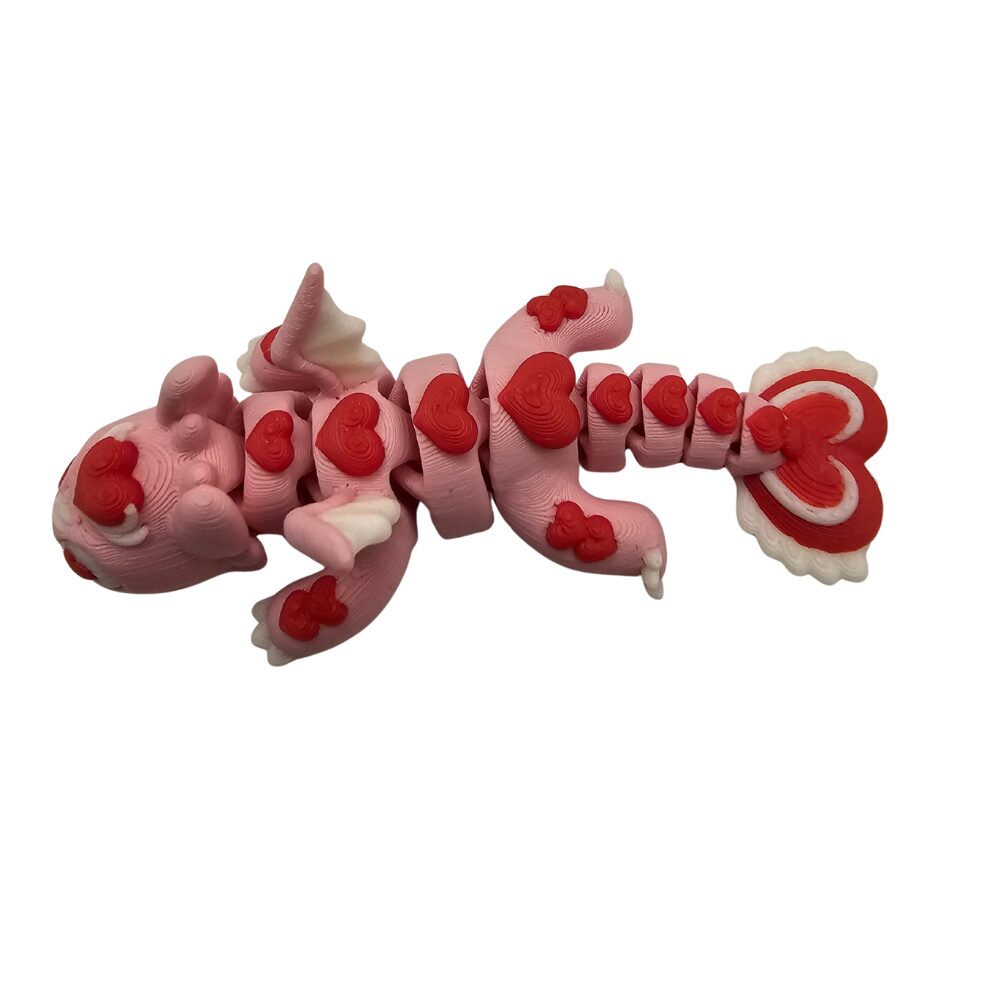 Smok ma delikatny, różowy kolor. Czerwone serca są wyraźnie zaznaczone na całym ciele. Duże oczy dodają figurce łagodności. Detale są wyraźne i romantyczne.