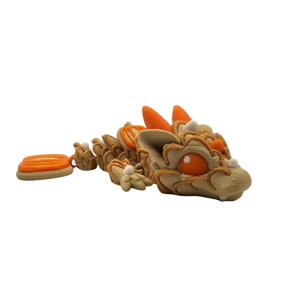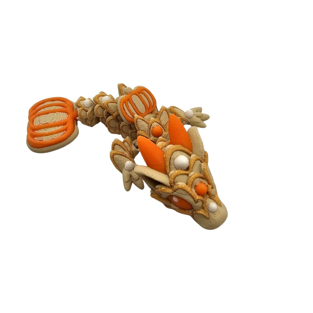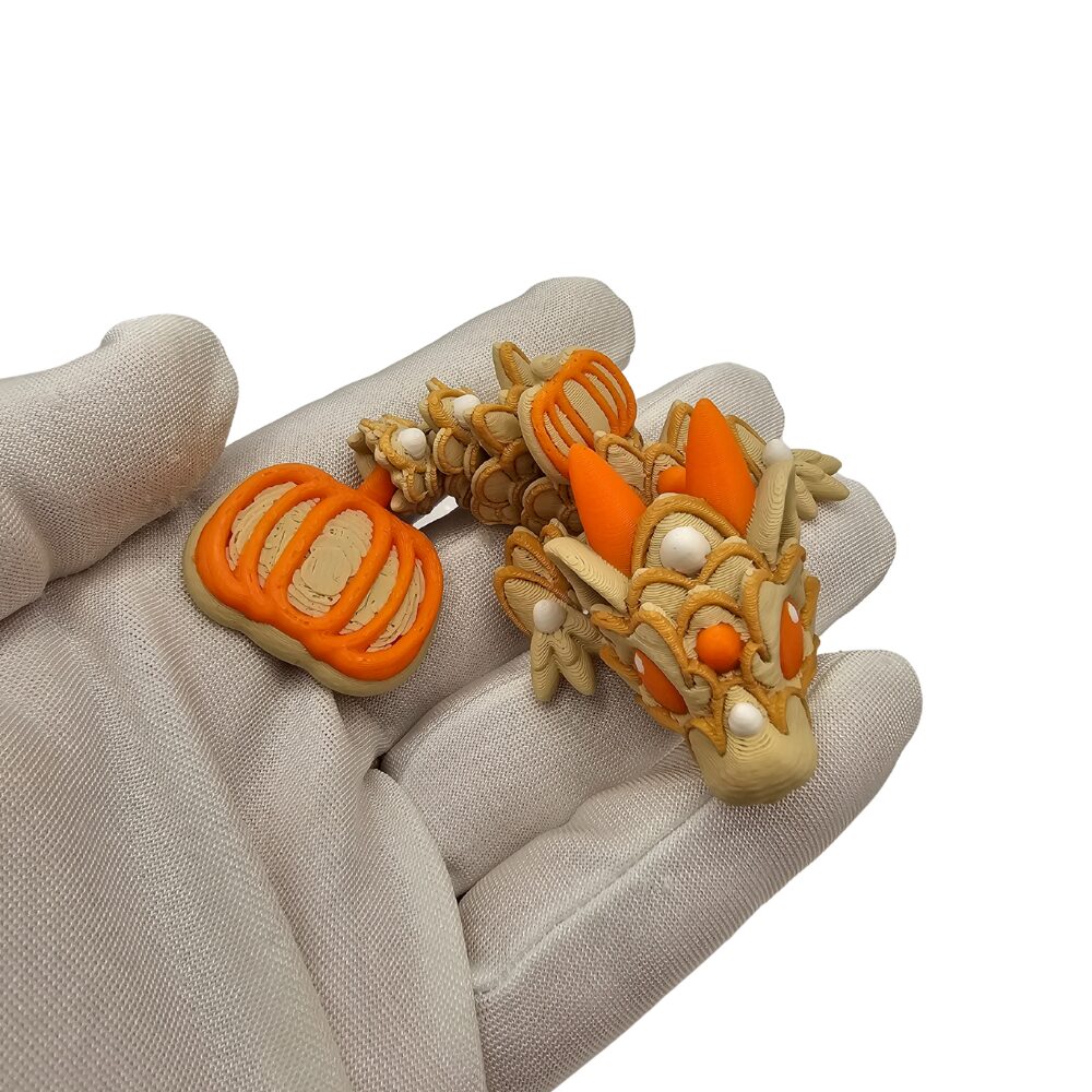 Mini Smok Pumpkin Pie to mała figurka smoka w jesiennej stylistyce. Ma ciepłą, pomarańczowo-kremową kolorystykę. Wyróżnia się charakterystycznymi wzorami dyni. Skrzydła i ogon przypominają płatki dyni lub jesienne liście.
