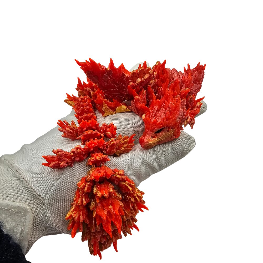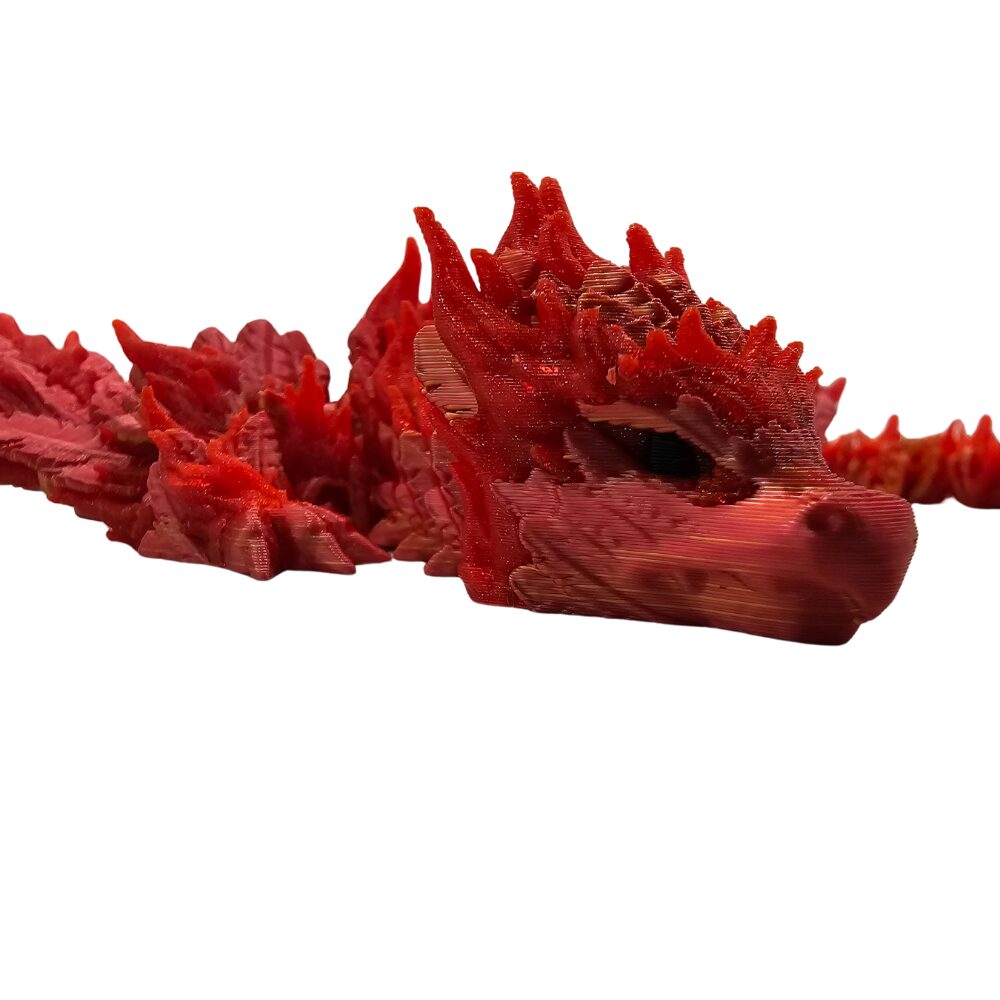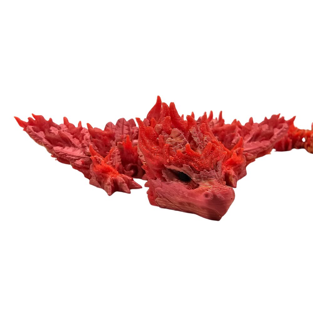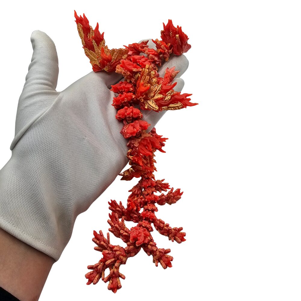 Smok ma spektakularną płomienną czerwono-żółtą kolorystykę charakterystyczną dla smoków ognia. Wykonany jest z elastycznego tworzywa sztucznego przy użyciu technologii druku 3D flexi. Intensywna czerwona kolorystyka dominuje na ciele smoka, nadając mu ognisty, płomienny wygląd. Żółte i pomarańczowe akcenty tworzą efekt języków płomieni i żaru. Wielka głowa smoka z otwartą paszczą pełną ostrych zębów jest majestatyczna i groźna. Rogi na głowie są charakterystyczne dla smoków. Potężne skrzydła umożliwiają lot i dodają epickich proporcji. Cztery łapy z ostrymi pazurami są potężne. Długi segmentowany ogon stanowi większość długości smoka. Detale łusek i tekstury smoczej skóry są wyraźnie widoczne. Imponujący rozmiar 30cm czyni smoka spektakularną dekoracją. Smok ma w pełni ruchome segmentowane ciało flexi, co oznacza, że można swobodnie zwijać, wyginać i układać całe ciało, szyję, ogon i skrzydła w nieskończone kształty – od zwinięty w spiralę, przez fale i esowate kształty, po dynamiczne pozy lotu lub ataku. Latająca lub czołgająca się poza jest typowa dla smoków. Detale są precyzyjnie wykonane mimo wielkości dzięki technologii druku 3D. Widać wyraźną płomienną kolorystykę. Widać głowę z rogami. Widać skrzydła. Widać łapy z pazurami. Widać długi ogon. Charakterystyczna struktura flexi pozwala na nieskończoną zabawę i interakcję z figurką. Powierzchnia ma charakterystyczne, lekko widoczne warstwy typowe dla druku 3D, co nadaje figurce unikalny, rękodzielniczy charakter.