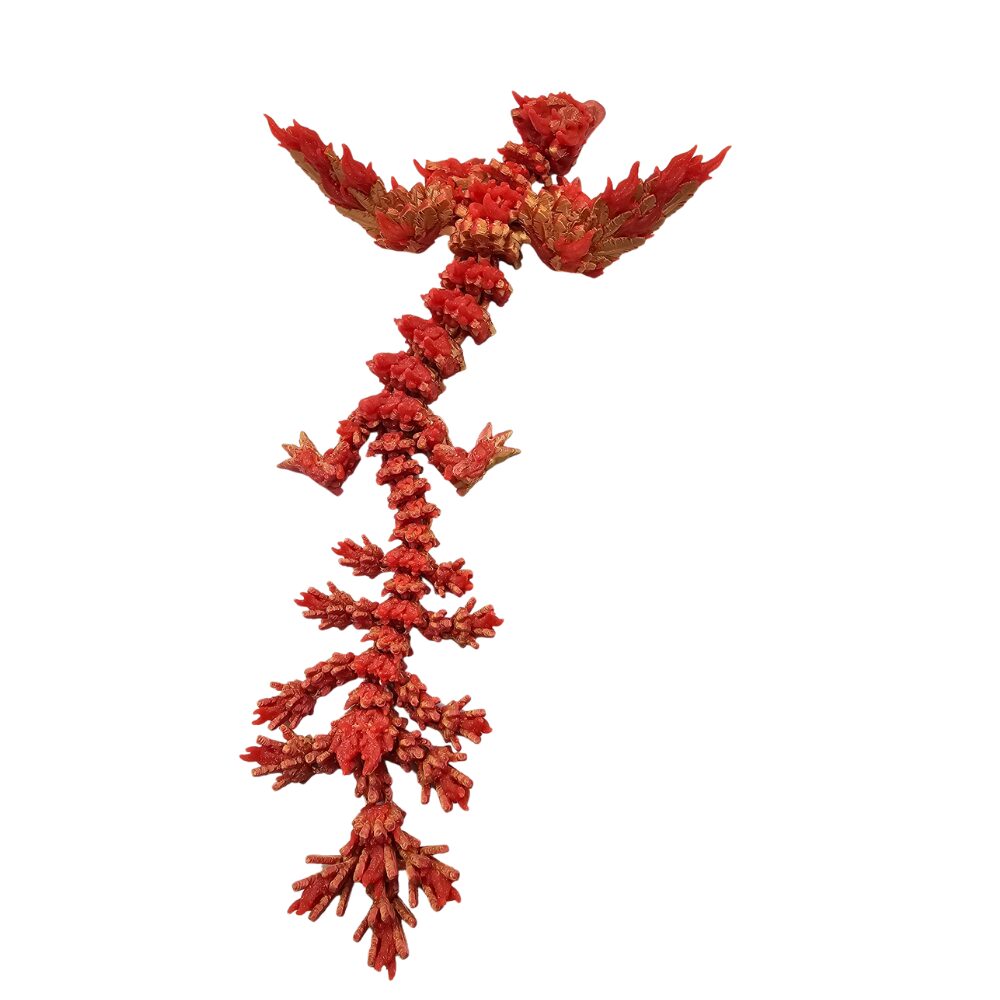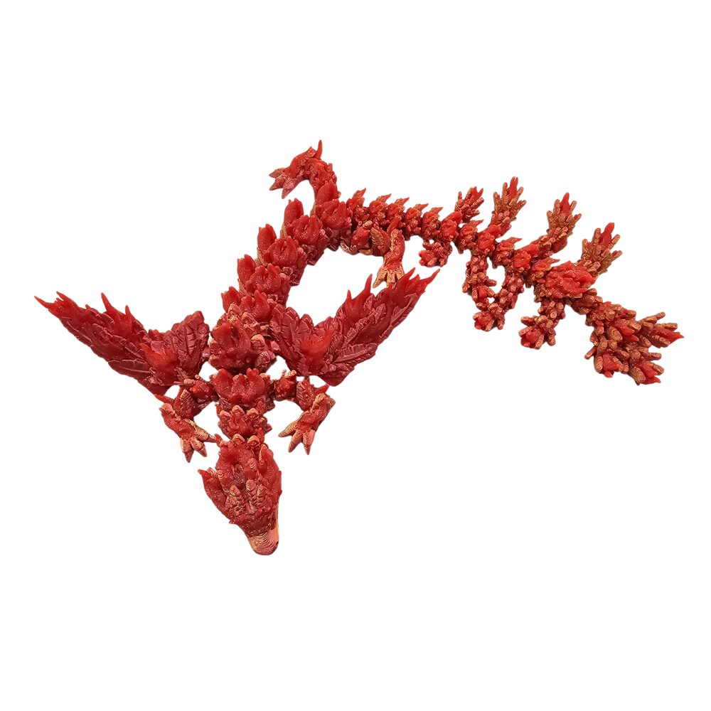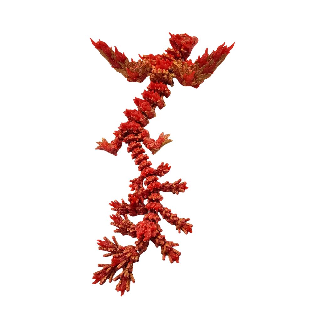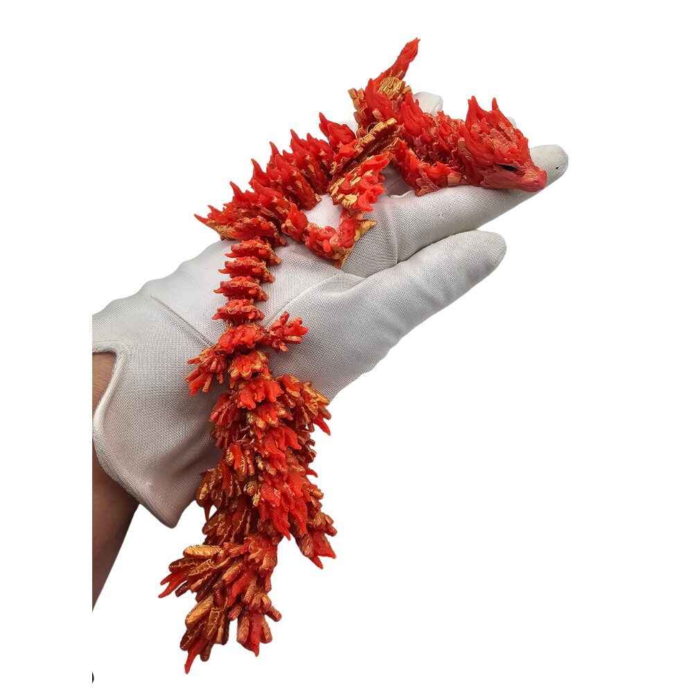 Smok ma spektakularną płomienną czerwono-żółtą kolorystykę charakterystyczną dla smoków ognia. Wykonany jest z elastycznego tworzywa sztucznego przy użyciu technologii druku 3D flexi. Intensywna czerwona kolorystyka dominuje na ciele smoka, nadając mu ognisty, płomienny wygląd. Żółte i pomarańczowe akcenty tworzą efekt języków płomieni i żaru. Wielka głowa smoka z otwartą paszczą pełną ostrych zębów jest majestatyczna i groźna. Rogi na głowie są charakterystyczne dla smoków. Potężne skrzydła umożliwiają lot i dodają epickich proporcji. Cztery łapy z ostrymi pazurami są potężne. Długi segmentowany ogon stanowi większość długości smoka. Detale łusek i tekstury smoczej skóry są wyraźnie widoczne. Imponujący rozmiar 30cm czyni smoka spektakularną dekoracją. Smok ma w pełni ruchome segmentowane ciało flexi, co oznacza, że można swobodnie zwijać, wyginać i układać całe ciało, szyję, ogon i skrzydła w nieskończone kształty – od zwinięty w spiralę, przez fale i esowate kształty, po dynamiczne pozy lotu lub ataku. Latająca lub czołgająca się poza jest typowa dla smoków. Detale są precyzyjnie wykonane mimo wielkości dzięki technologii druku 3D. Widać wyraźną płomienną kolorystykę. Widać głowę z rogami. Widać skrzydła. Widać łapy z pazurami. Widać długi ogon. Charakterystyczna struktura flexi pozwala na nieskończoną zabawę i interakcję z figurką. Powierzchnia ma charakterystyczne, lekko widoczne warstwy typowe dla druku 3D, co nadaje figurce unikalny, rękodzielniczy charakter.