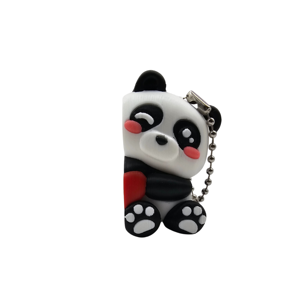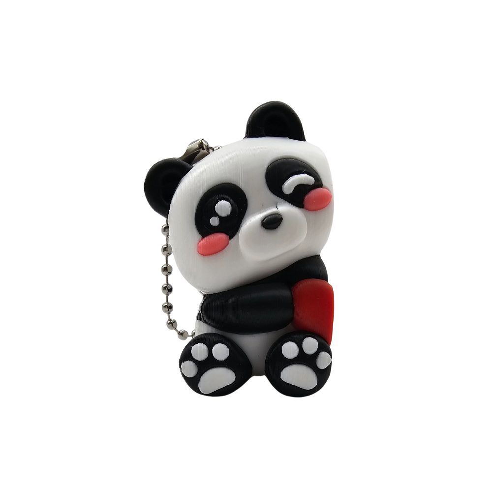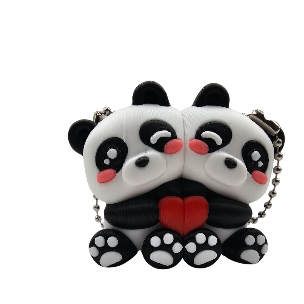 Pandy mają klasyczny czarno-biały kolor charakterystyczny dla tych zwierząt. Wykonane są z gładkiego, matowego tworzywa sztucznego przy użyciu technologii druku 3D. Białe ciało kontrastuje z czarnymi uszami, czarnymi łapami przednimi i tylnymi oraz czarnymi nogami. Duże czarne oczy i różowe policzki nadają im kawaii charakter. Różowe łapki tworzą słodki akcent kolorystyczny. Charakterystyczny gest trzymania czerwonego serduszka sprawia, że wyglądają na zakochane lub przyjacielsko nastawione. Detale są precyzyjnie wykonane dzięki technologii druku 3D. Widać małe łapki każdej pandy z różowymi poduszeczkami. Widać ekspresyjne twarze z uśmiechem. Widać wspólnie trzymane serce między nimi. Całość wygląda jak para zakochanych pand w miniaturze. Czarne uszy są okrągłe i wyraźnie zaznaczone. Dolne łapki mają różowe poduszeczki, co dodaje uroczego detalu. Serduszko ma klasyczny kształt i jest wykonane w intensywnym czerwonym kolorze. Powierzchnia ma charakterystyczne, lekko widoczne warstwy typowe dla druku 3D, co nadaje im unikalny, rękodzielniczy charakter.