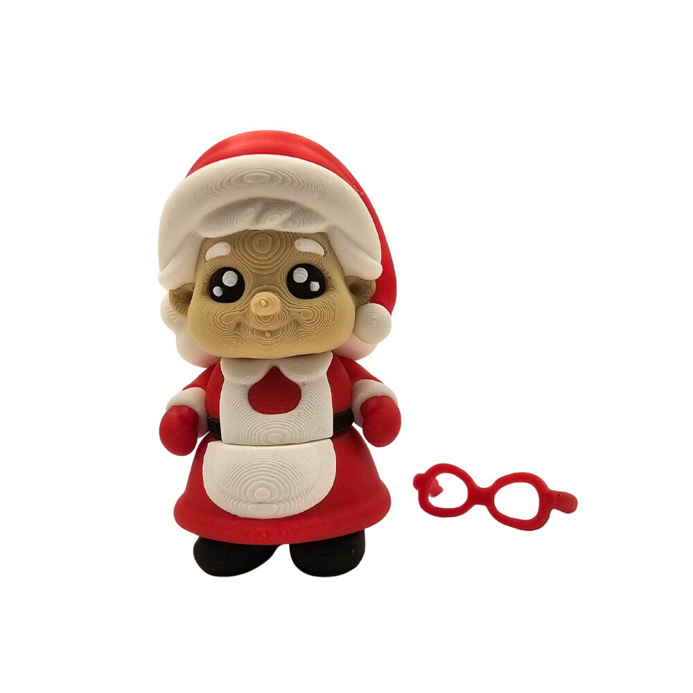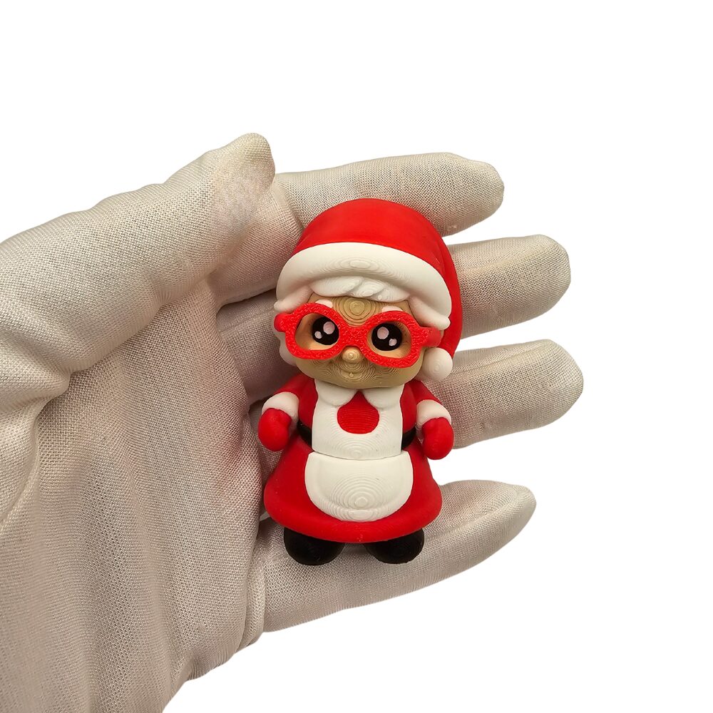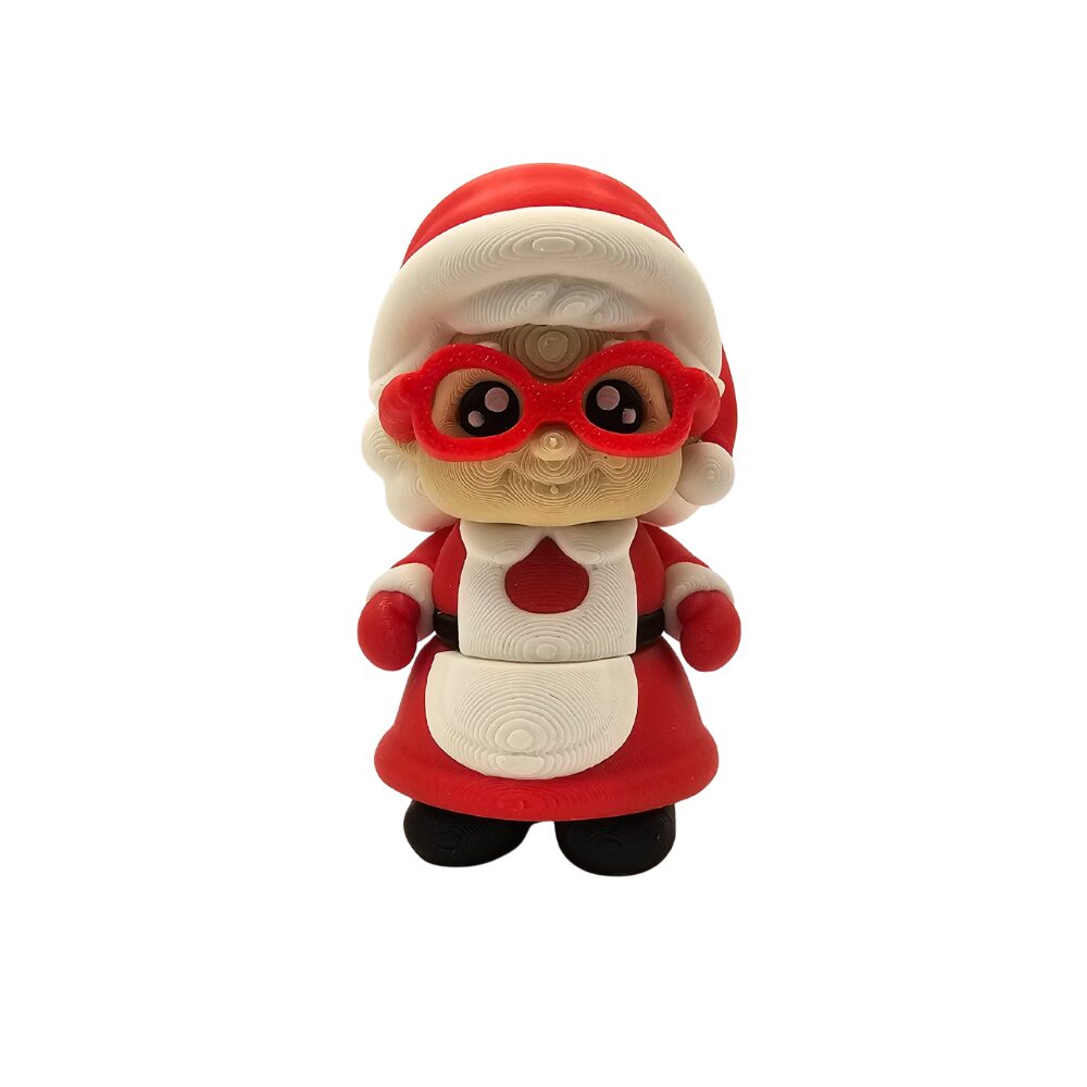 Charakterystyczna czerwona czapka Mikołaja z białym obszyciem i pomponem, czerwone okulary w stylu retro lub cat-eye, beżowo-kremowa twarz z rumianymi policzkami, duże czarne oczy w stylu cute, czerwona sukienka lub bluza, biały fartuch lub obszyciem na brzuchu, czerwone rękawy, czarne buty oraz pozycja stojąca z rączkami przy ciele tworzą kompletny, pełen uroku wygląd. Wykonana z wysokiej jakości tworzywa sztucznego figurka zachwyca precyzyjnymi detalami i przyjaznym charakterem.