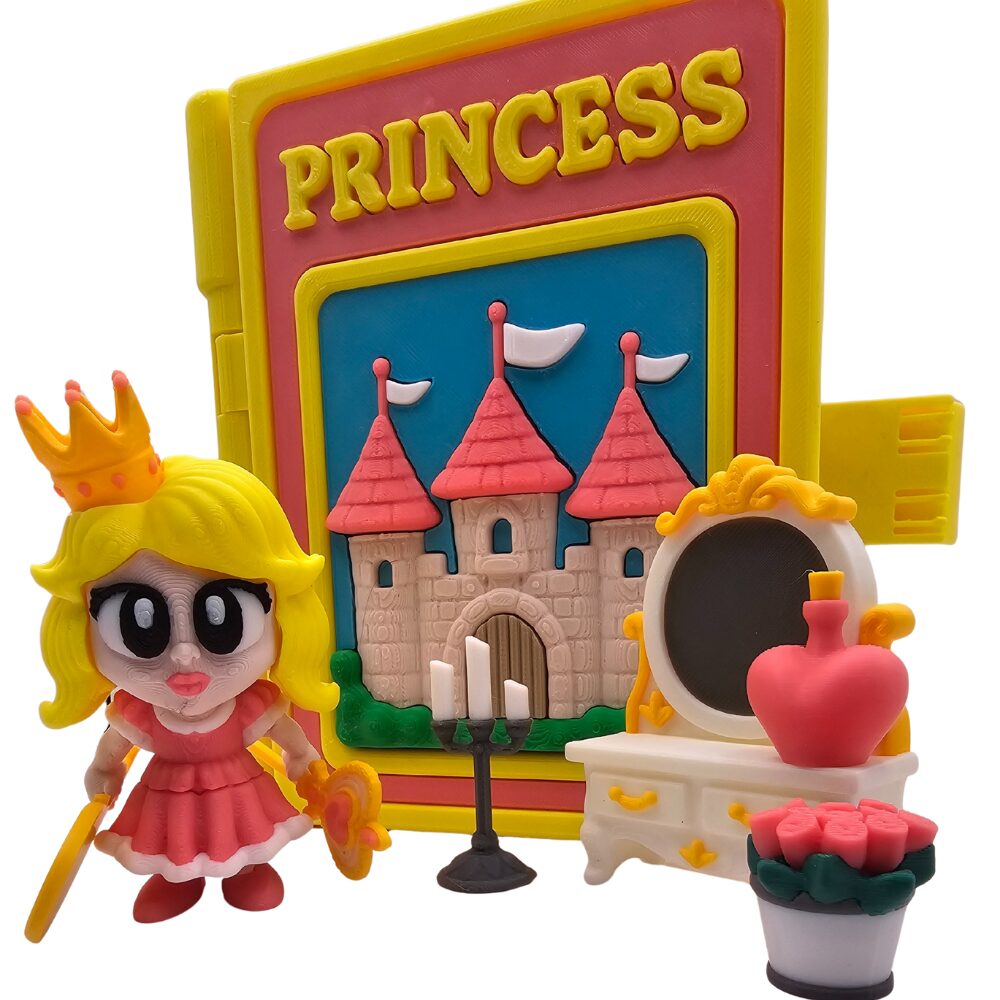 Princess Set Zestaw to nie pojedyncza figurka, ale pełna kompozycja bajkowa prezentowana w ozdobnej żółtej ramce z napisem „PRINCESS” i grafiką zamku. Ta ramka/pudełko tworzy teatralną oprawę dla całej sceny, jakby była to ilustracja z książki bajkowej lub scena z dziecięcego spektaklu. Графика zamku z różowymi wieżami na tle błękitnego nieba wzmacnia bajkową atmosferę i natychmiast identyfikuje tematykę zestawu. To eleganckie rozwiązanie sprawia, że zestaw prezentuje się jak mini-diorama lub scena ze skrzynki teatralnej, gotowa do wystawienia na półce lub w gablocie.