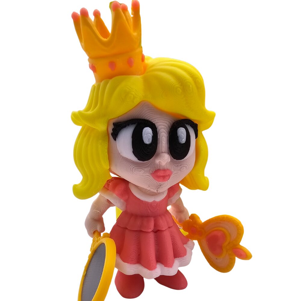 Postać księżniczki reprezentuje klasyczną bohaterkę bajkową: nosi długą różową suknię (kolor kojarzony z księżniczkami i romantycznością), ma blond włosy (typowe dla wielu księżniczek z bajek) i cute, uproszczoną stylistykę z dużą główką i dużymi oczami charakterystyczną dla kawaii aesthetic. Różowa suknia jest elegancka i długa, co nadaje postaci dostojności i królewskiego charakteru. Księżniczka jest główną bohaterką tej sceny i reprezentuje archetyp księżniczki z klasycznych baśni – pięknej, delikatnej i królewskiej.