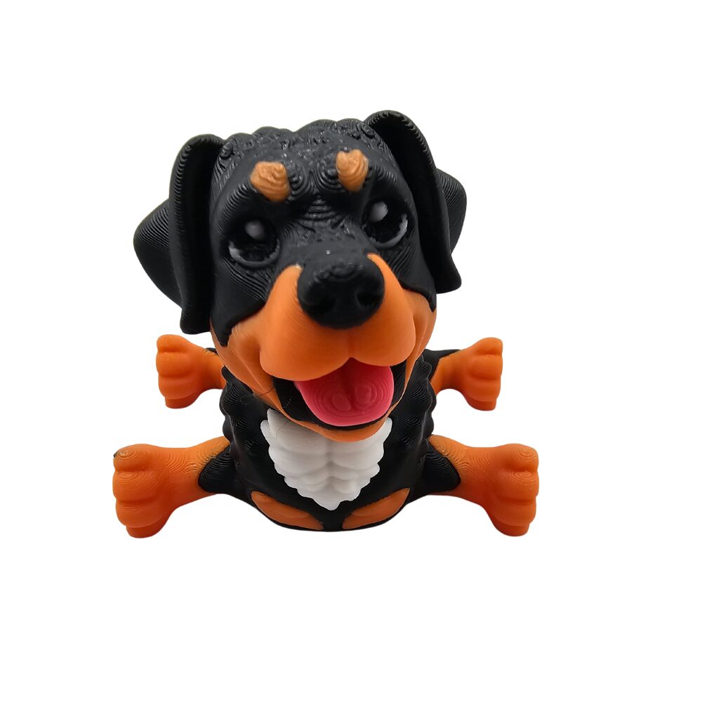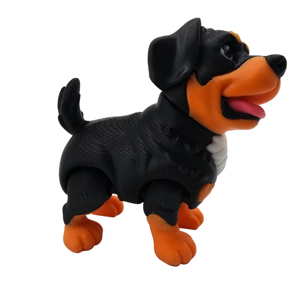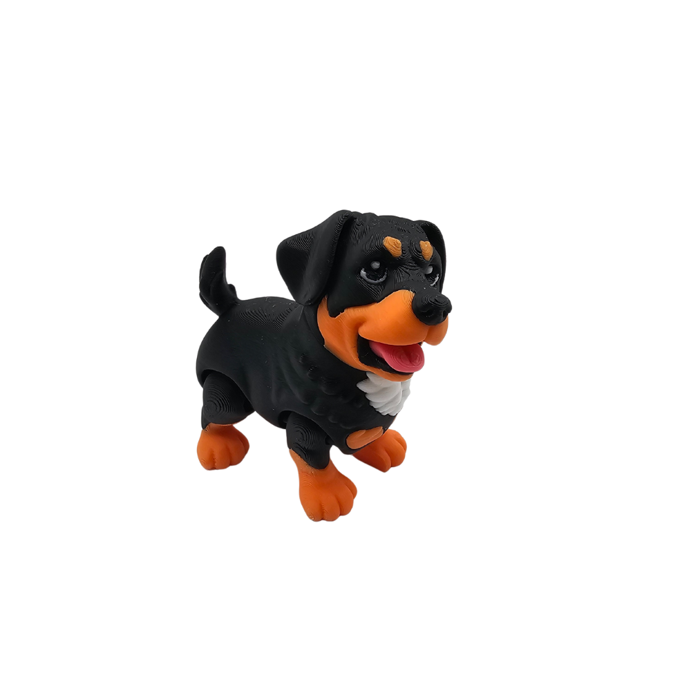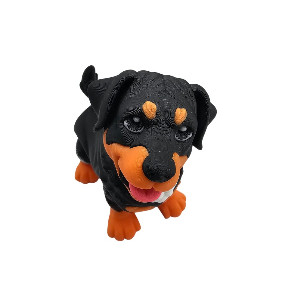 Rottweiler ma charakterystyczną kolorystykę typową dla tej rasy psów. Wykonany jest z elastycznego tworzywa sztucznego przy użyciu technologii druku 3D flexi. Czarne futro z brązowymi znaczeniami nad oczami, na pyszczku, łapkach i dolnej części ciała wiernie oddaje wygląd prawdziwego rottweilera. Różowy wystawiony języczek nadaje figurce uroczego, wesołego wyrazu. Duże czarne oczy nadają psu kawaii charakter. Piesek ma ruchome łapki, ogon i prawdopodobnie głowę, które można delikatnie zginać i ustawiać w różnych pozycjach. Siedząca poza z lekko rozkraczonymi łapkami jest typowa dla szczeniąt. Detale są precyzyjnie wykonane dzięki technologii druku 3D. Widać wyraźne brązowe znaczenia w charakterystycznych miejscach. Widać uroczy pyszczek z wystawionym języczkiem. Widać małe łapki i ogon. Widać naturalne proporcje ciała rottweilera. Charakterystyczna struktura flexi pozwala na zabawę i interakcję z figurką. Powierzchnia ma charakterystyczne, lekko widoczne warstwy typowe dla druku 3D, co nadaje figurce unikalny, rękodzielniczy charakter.