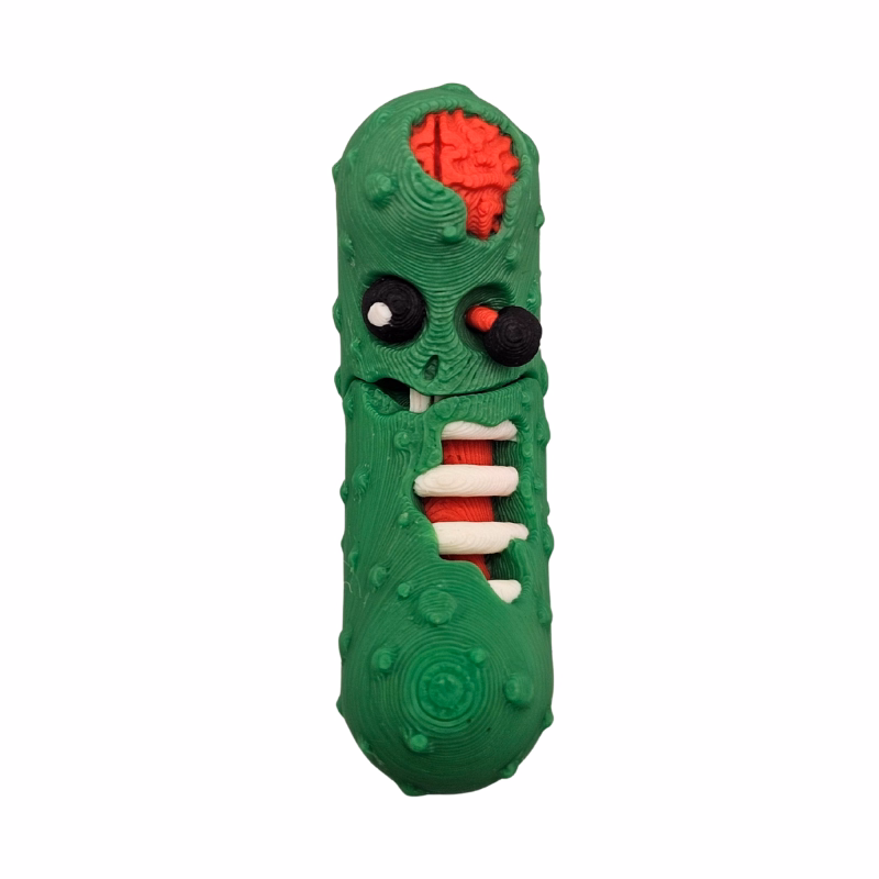 Ruchomy Pickle Zombie | Figurka to nietuzinkowa figurka kolekcjonerska, która łączy w sobie groteskowy humor z klimatem grozy. Model przedstawia ogórka „pickla” stylizowanego na zombie – z charakterystycznymi ranami, przerażającym wyrazem twarzy i ruchomymi elementami, które nadają mu dynamicznego wyglądu.