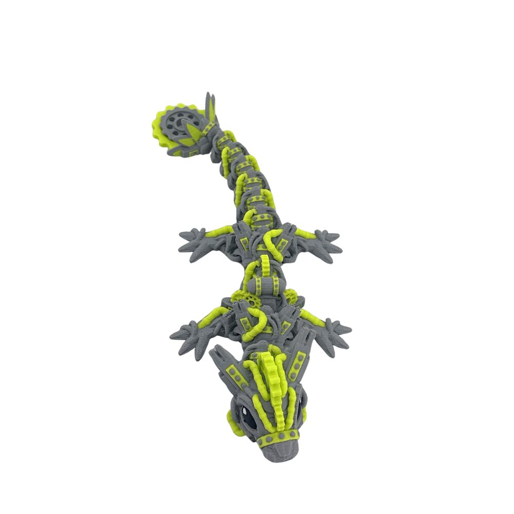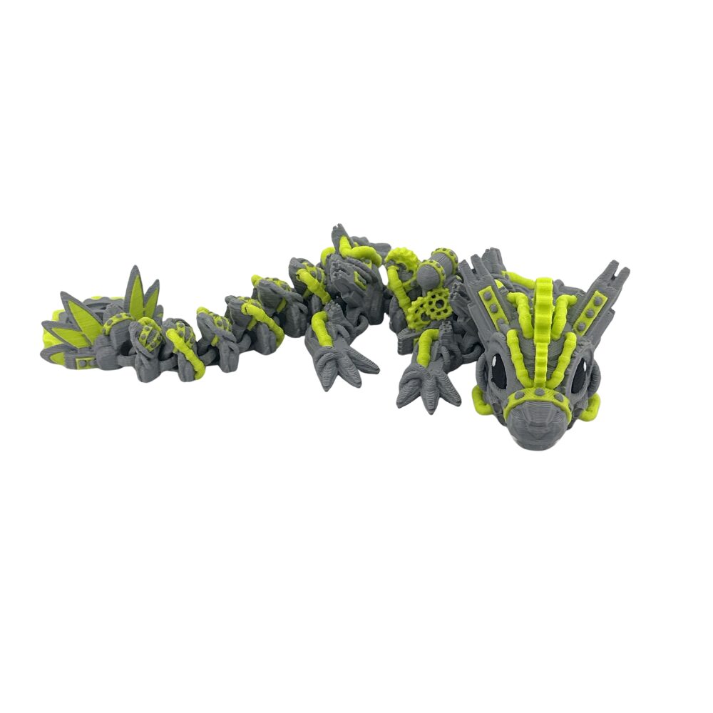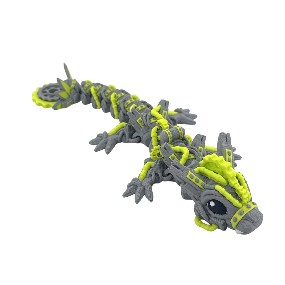 Figurka przedstawia smoka o mechanicznym ciele złożonym z kół zębatych, zawiasów i metalowych segmentów. Jego skrzydła, ogon i głowa pełne są detali przypominających precyzyjne mechanizmy starych maszyn. Metaliczne wykończenie w odcieniach miedzi, brązu i srebra nadaje mu industrialnego charakteru, a delikatne cieniowanie podkreśla trójwymiarowy efekt.