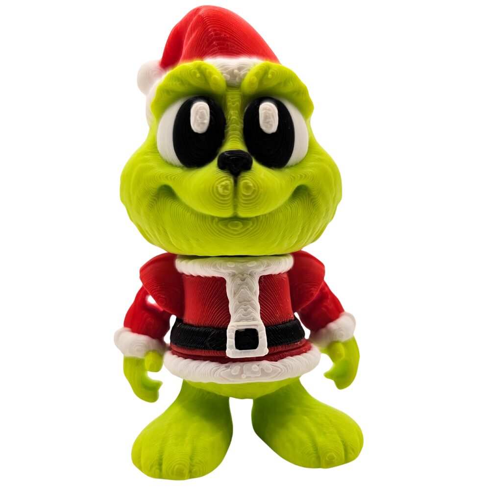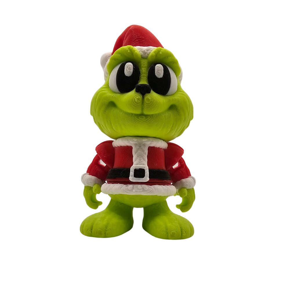 Charakterystyczna jasno-zielona skóra/futro Grincha, czerwona czapka Mikołaja z białym obszyciem i pomponem, duże czarne oczy z wyrazem, czarny nosek, charakterystyczny uśmiech, czerwony strój Mikołaja z białym obszyciem, czarny pasek z białą klamrą oraz siedząca pozycja z zielonymi łapkami tworzą kompletny, humorystyczny wygląd. Wykonana z wysokiej jakości tworzywa sztucznego figurka zachwyca precyzyjnymi detalami i ironicznym charakterem.