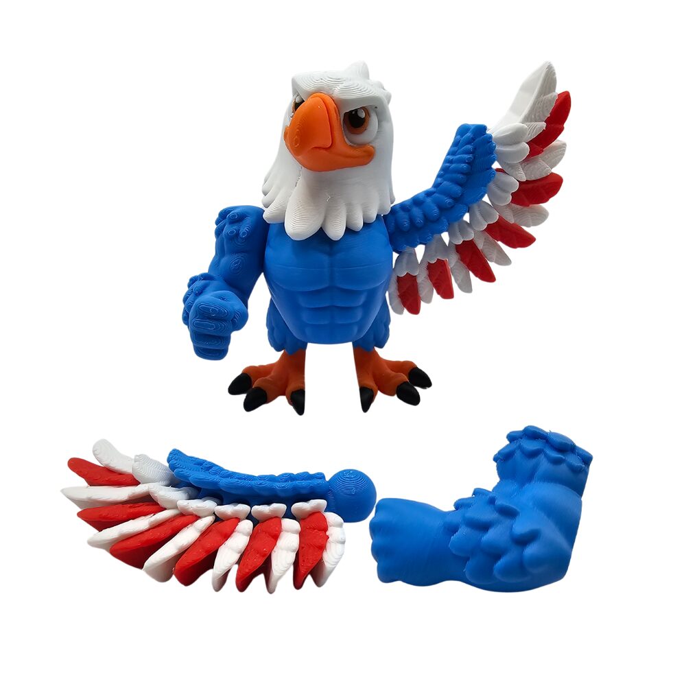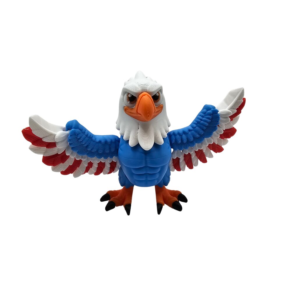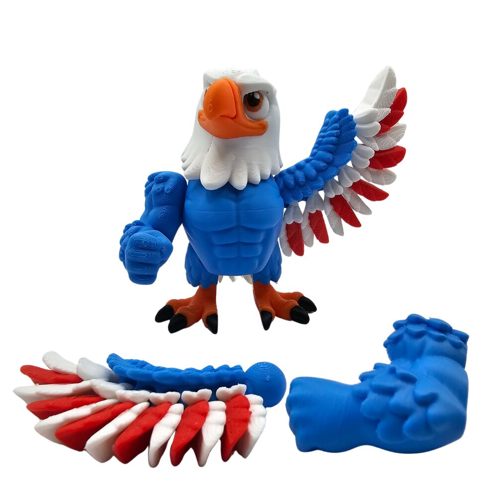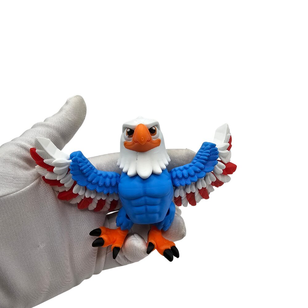 Wspaniały orzeł w biało-niebiesko-czerwonych barwach 🦅 Figurka flexi 3D z ruchomymi skrzydłami, nogami, ogonem i wymiennymi rękami. Patriotyczny ptak kawaii.
