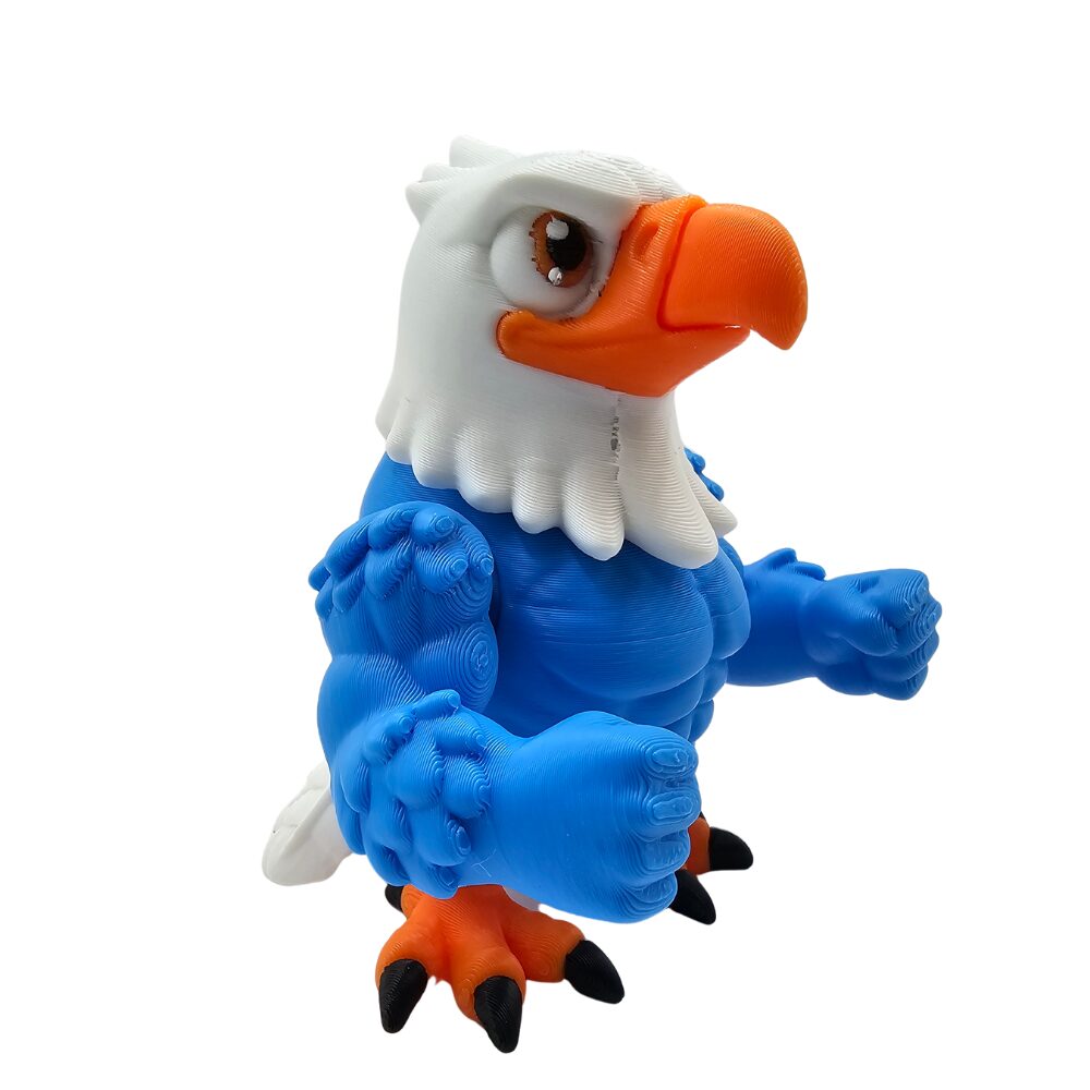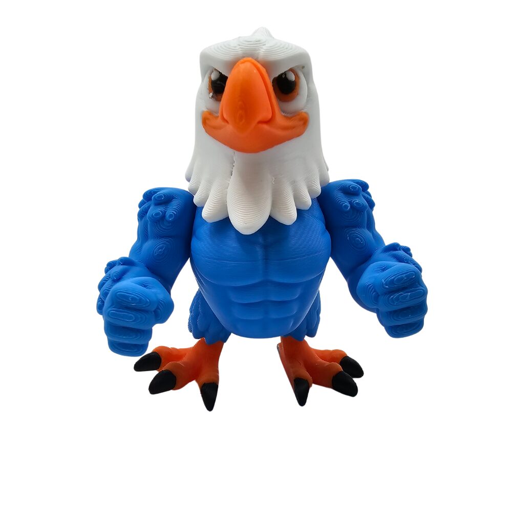 Orzeł ma spektakularną kolorystykę w barwach biało-niebiesko-czerwonych. Wykonany jest z elastycznego tworzywa sztucznego przy użyciu technologii druku 3D flexi. Niebieskie ciało jest głównym kolorem orła, symbolizującym niebo. Biały kołnierz z piór wokół szyi przypomina charakterystyczny biały kołnierz orła bielika lub orła amerykańskiego. Czerwono-białe skrzydła z wyraźnymi piórami tworzą spektakularną patriotyczną kolorystykę nawiązującą do polskiej flagi. Pomarańczowa głowa z żółtym dziobem jest charakterystyczna dla wielu gatunków orłów. Duże czarne oczy nadają orłowi kawaii charakter i dumny, majestatyczny wyraz. Pomarańczowe nogi z czarnymi pazurami są typowe dla drapieżnych ptaków. Ogon z piórami jest charakterystyczny dla orłów. Orzeł ma ruchomą głowę, ruchome skrzydła (lub ręce), ruchome nogi i ruchomy ogon, które można delikatnie zginać i ustawiać w różnych pozycjach. Unikalna cecha: wymienne ręce – można zamienić skrzydła z piórami na muskularne ręce, dając orłowi zupełnie inny charakter – od majestatycznego ptaka do silnego, antropomorficznego orła-wojownika. Stojąca lub latająca poza z rozpostartymi skrzydłami jest typowa dla orłów. Detale są precyzyjnie wykonane dzięki technologii druku 3D. Widać wyraźne pióra na skrzydłach. Widać biały kołnierz. Widać pomarańczową głowę z dziobem. Widać nogi z pazurami. Widać ogon. Charakterystyczna struktura flexi pozwala na zabawę i interakcję z figurką. Powierzchnia ma charakterystyczne, lekko widoczne warstwy typowe dla druku 3D, co nadaje figurce unikalny, rękodzielniczy charakter.